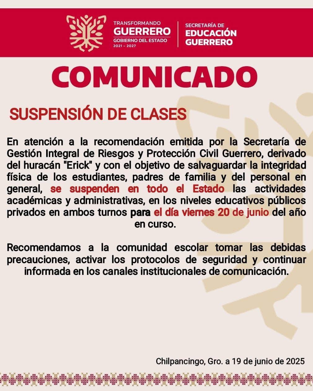 Chilpancingo, 19 de junio de 2025.— La Secretaría de Educación Guerrero (SEG) informó que se mantendrá la suspensión total de actividades académicas y administrativas en todos los planteles educativos del estado para este viernes 20 de junio, como medida preventiva ante los efectos del huracán Erick.
