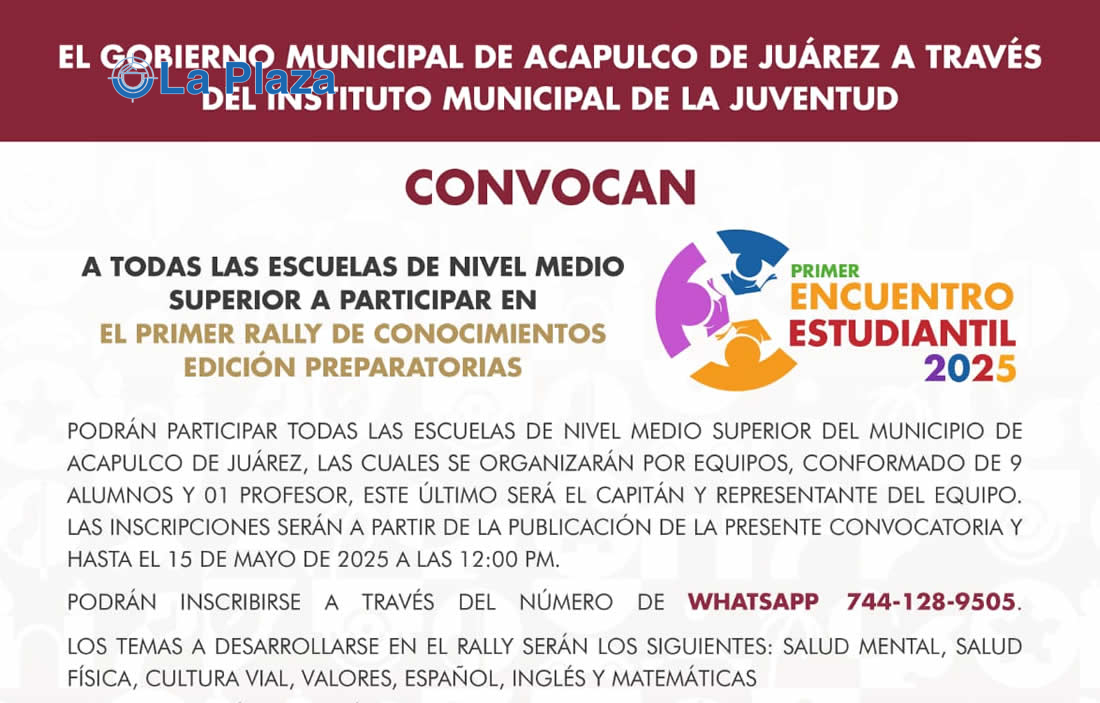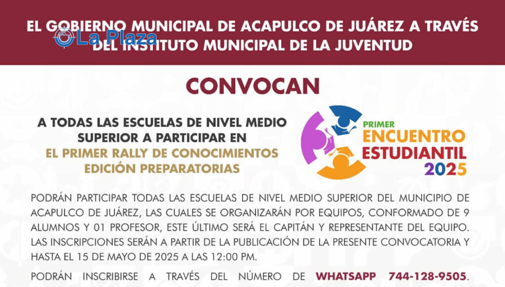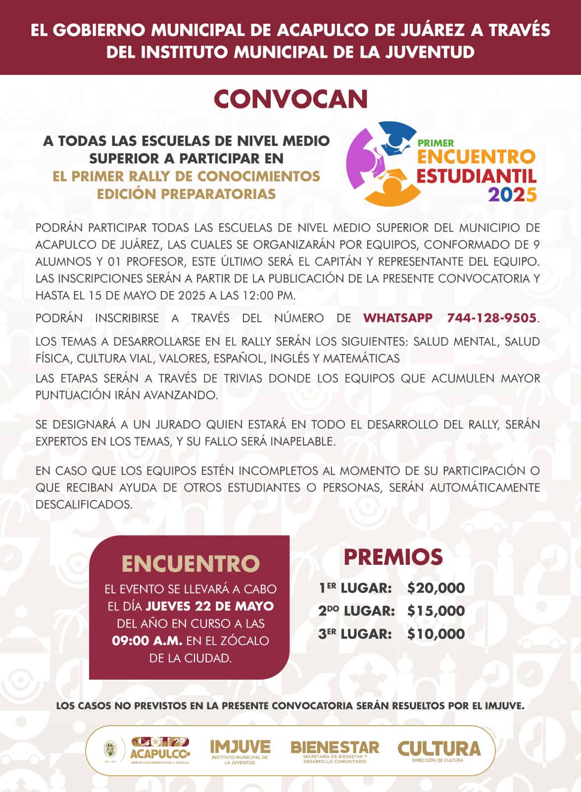 Acapulco, 07 de mayo de 2025.– El Gobierno Municipal de Acapulco, a través del Instituto Municipal de la Juventud (Imjuve), lanzó la convocatoria para que todas las escuelas de nivel medio superior del municipio participen en el Primer Rally de Conocimientos, edición preparatorias, como parte del Primer Encuentro Estudiantil 2025.