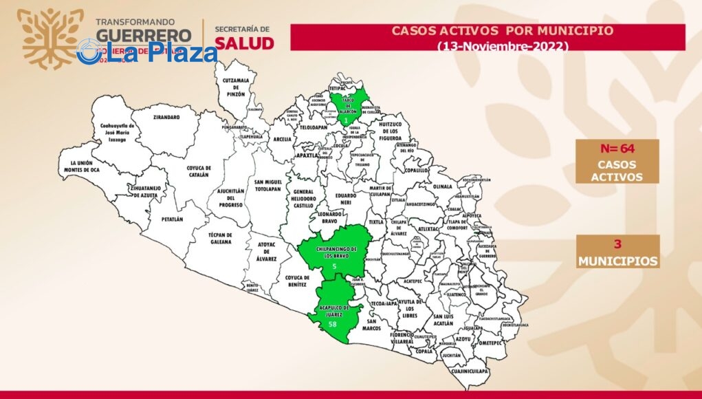 Indicó que el estado acumula 116 mil 102 casos confirmados y 6 mil 849 defunciones; además, ocupa el lugar 15 en casos activos a nivel nacional, distribuidos en tres municipios: Acapulco, con 58 casos; Chilpancingo, 5 y Taxco un solo caso.