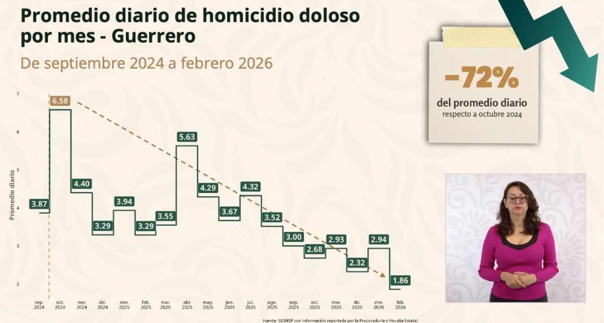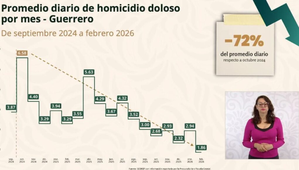 Ciudad de México, 10 de marzo de 2026. Como resultado de la estrategia de seguridad coordinada, la titular del Secretariado Ejecutivo del Sistema Nacional de Seguridad Pública, Marcela Figueroa, informó que el estado de Guerrero registra una reducción del 72 por ciento en el promedio diario de homicidio doloso por mes, en el periodo comprendido de octubre de 2024 (6.58) a febrero de 2026 (1.86).