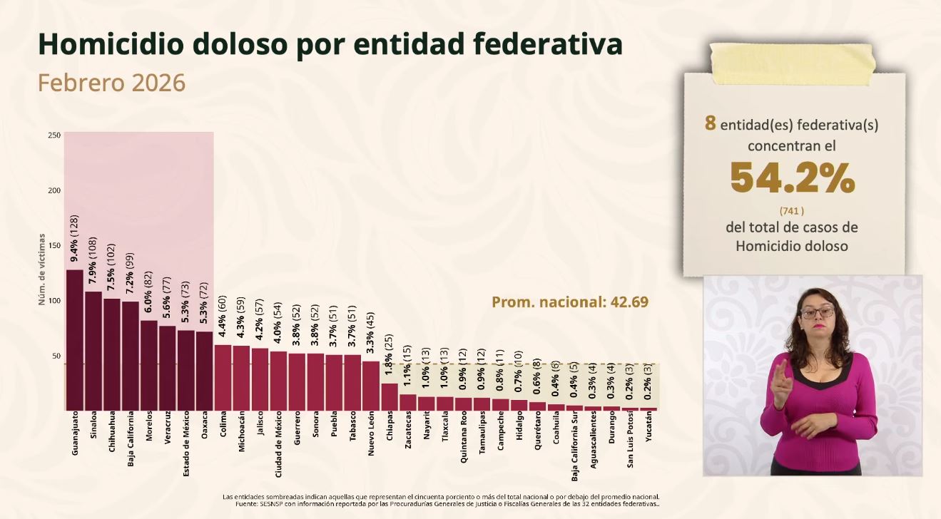 De acuerdo con el reporte de incidencia delictiva correspondiente a febrero de 2026, presentado en la conferencia matutina de la presidenta Claudia Sheinbaum Pardo, Guerrero logró descender hasta la posición número 13 a nivel nacional, con 52 víctimas de homicidio doloso, cifra menor en comparación con entidades como Guanajuato, que encabezó el listado con 128 víctimas.