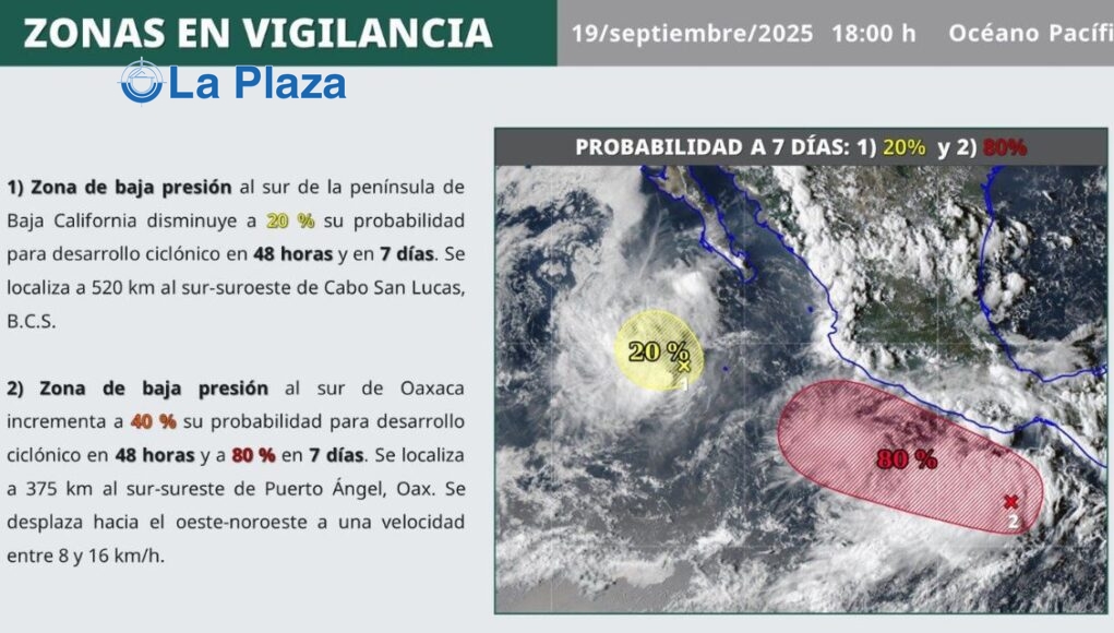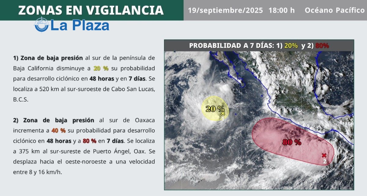 Se mantiene vigilancia sobre la zona de baja presión entre Oaxaca y Chiapas, con 30 % de probabilidad de desarrollo ciclónico a 48 horas y 70 % en los próximos cinco días.