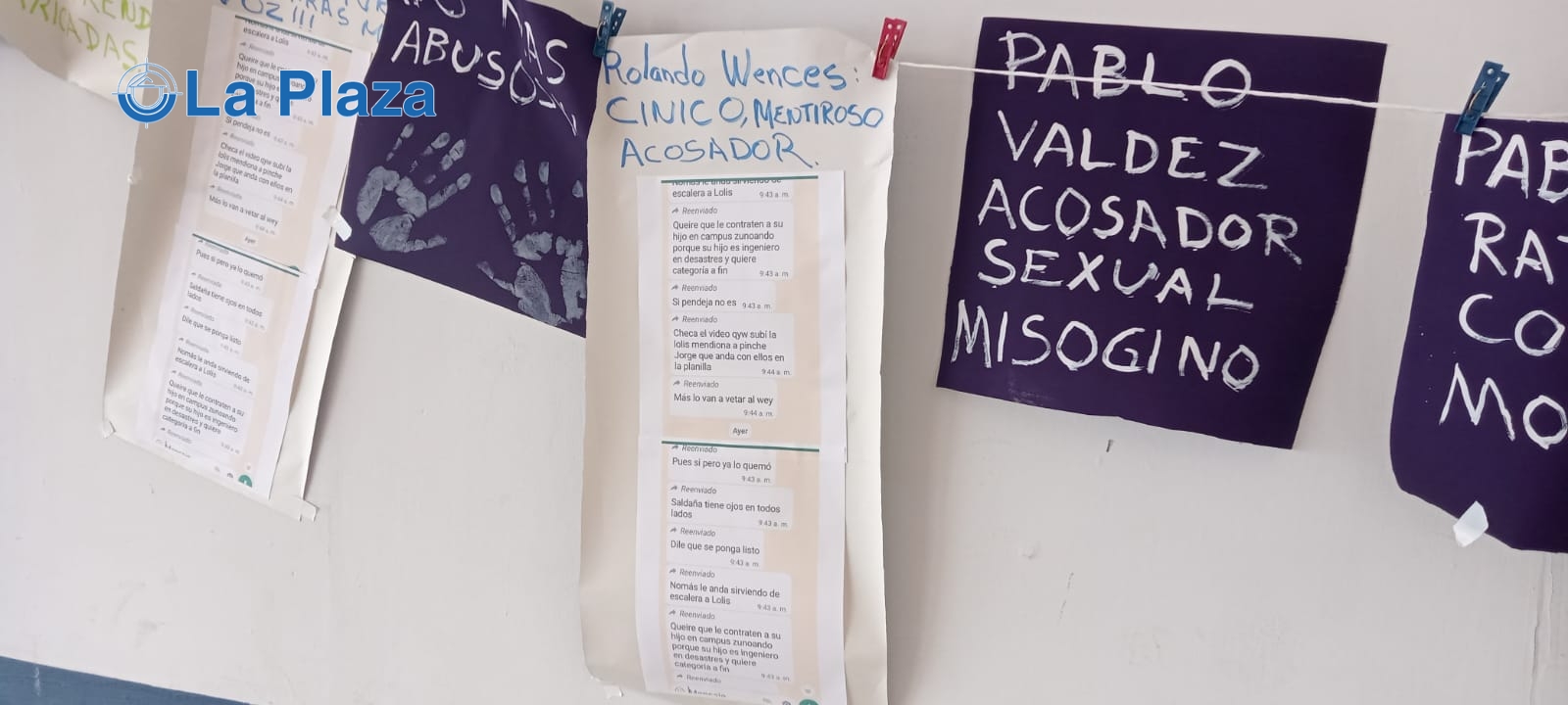 Chilpancingo, 10 de marzo de 2023. Una trabajadora de la Universidad Autónoma de Guerrero (UAGro), colocó la mañana de este viernes un tendedero en Rectoría para señalar discriminación y acoso sexual.
