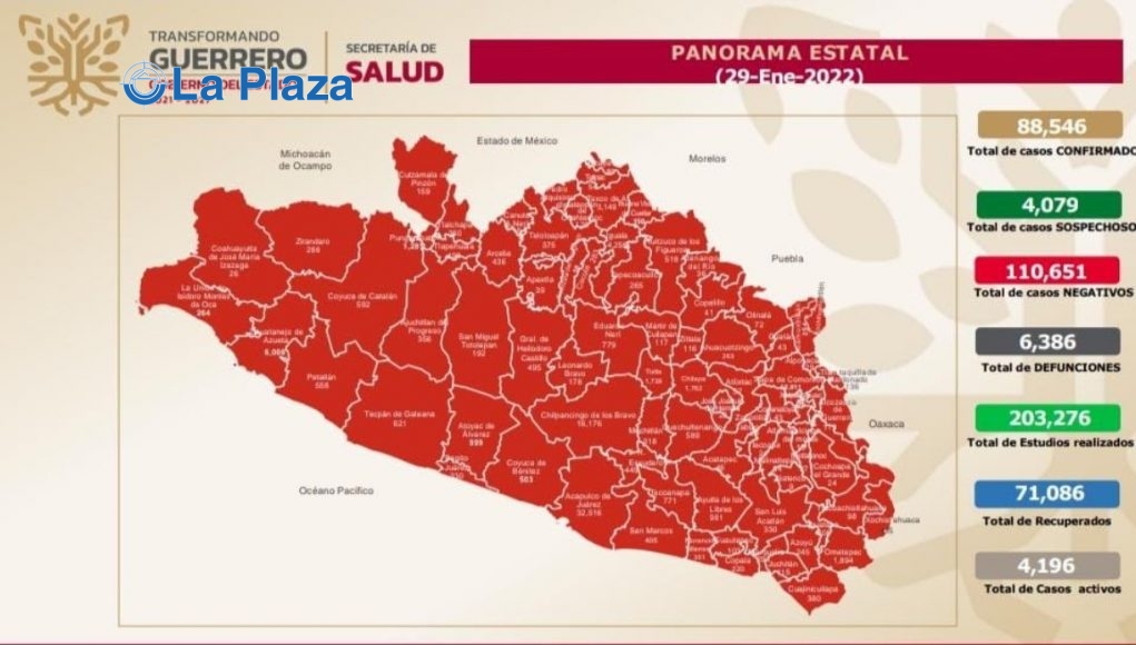Desde el inicio de la pandemia, en Guerrero se acumulan 88,546 casos confirmados y 6,386 defunciones a causa del Covid-19, de acuerdo con el informe “Covid-19 Guerrero”, que actualiza diariamente Salud estatal.